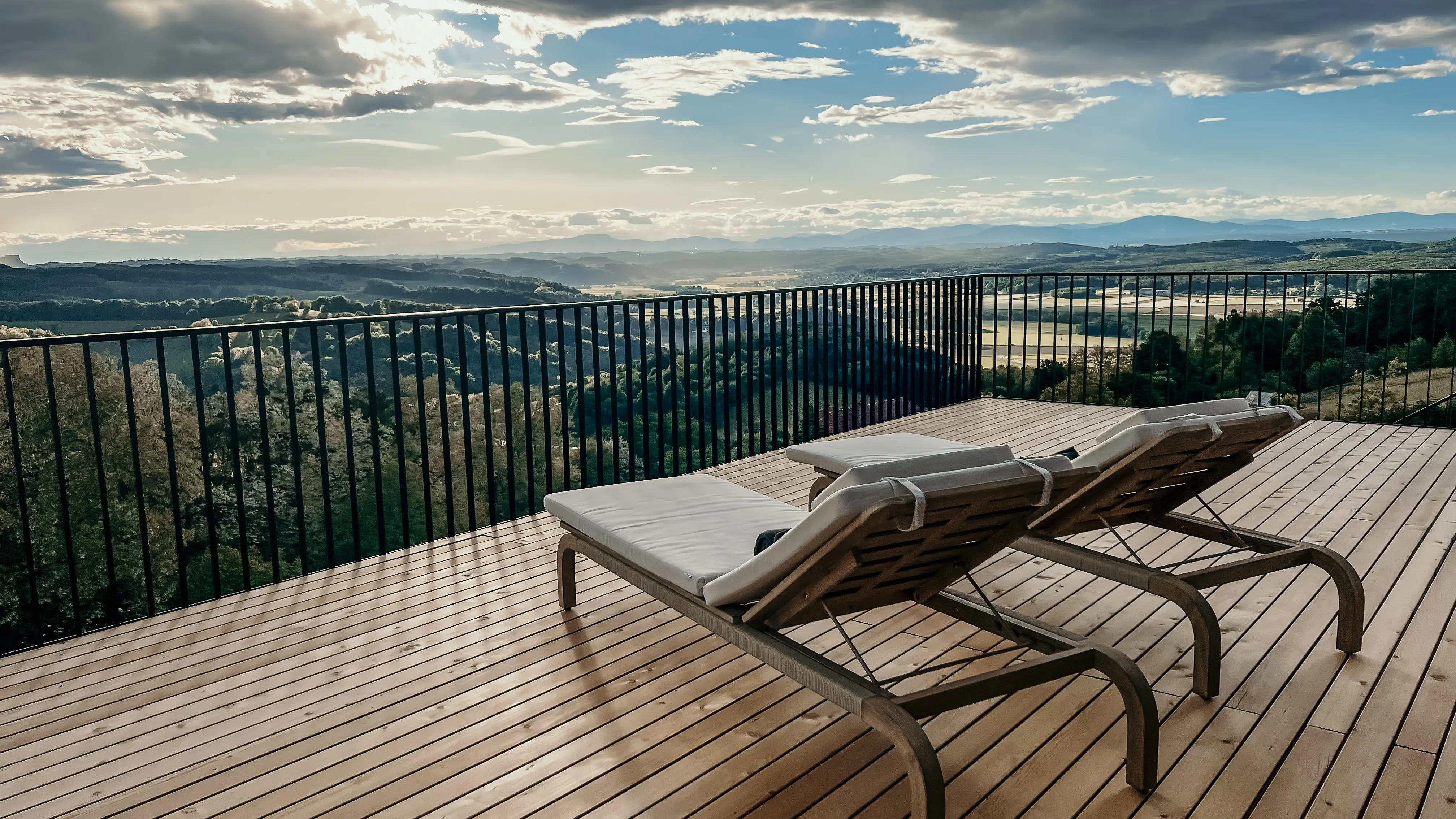 Die Sanierung und Erweiterung der Bretterbude respektieren den ursprünglichen Charakter des Gebäudes, das einst ein Gasthaus aus den 60er Jahren war. Durch die Kombination traditioneller Elemente mit moderner Architektur bleibt der Charme des Wirtshauses erhalten, während gleichzeitig neue, beeindruckende Akzente gesetzt werden. Eine Holzfassade, große Fenster und Schiebetüren öffnen das Gebäude zur Natur hin und lassen einen atemberaubenden Blick auf die umliegenden Weinberge und Hügel zu.