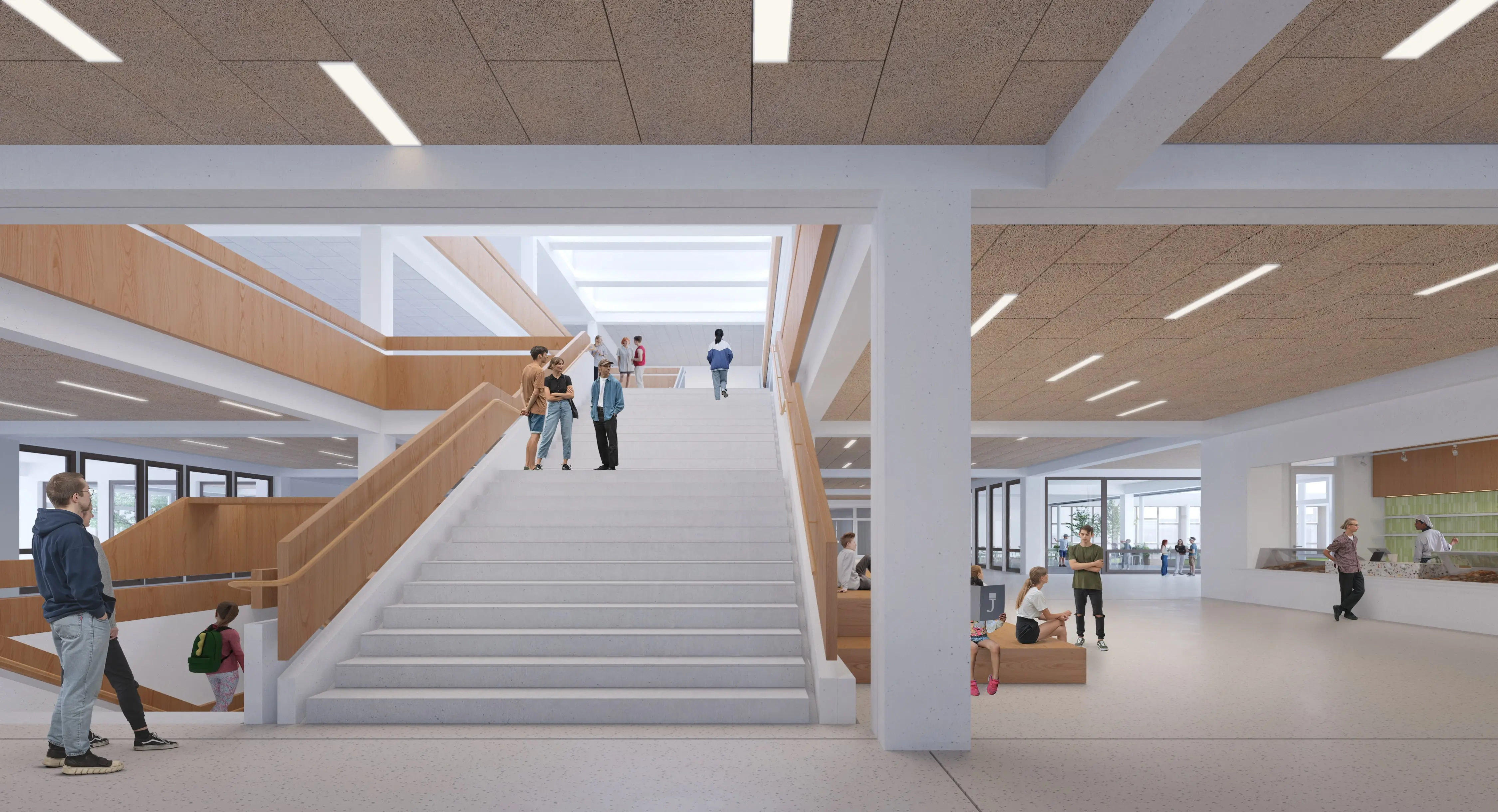 Das Projekt schafft zusätzliche Begegnungsräume und Aufenthaltszonen für die Schüler/innen in den bestehenden Innenhöfen. Diese werden durch die Neugestaltung der Mittelbereiche und die Öffnung der Klassenzimmer gestärkt und deutlich in den Mittelpunkt gerückt. Zusätzlich zu den bestehenden Innenhöfen werden neue Terrassen im ersten und zweiten Obergeschoss geschaffen, die durch Treppen mit den bestehenden Höfen verbunden sind. Die Terrassen und Treppenanlagen dienen im Brandfall auch zur Entfluchtung und ermöglichen dadurch im Inneren mehr Freiheiten bei der Möblierung der Aula. Die neuen Seitenfassaden der beiden Innenhöfe werden gestaffelt, um die Höhe des Gebäudes zu minimieren und den vorhandenen Maßstab des Gebäudes beizubehalten.