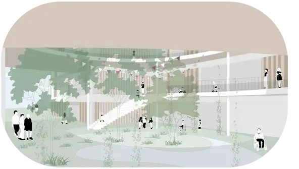 Inmitten des Projekts entfaltet sich ein zentraler, offener Bereich, der die Philosophie des Entwurfs widerspiegelt und als „OASE“ bezeichnet wird. Dieser Raum ist das Herzstück der Schule und verkörpert das Leitbild einer engen Beziehung zur Natur.