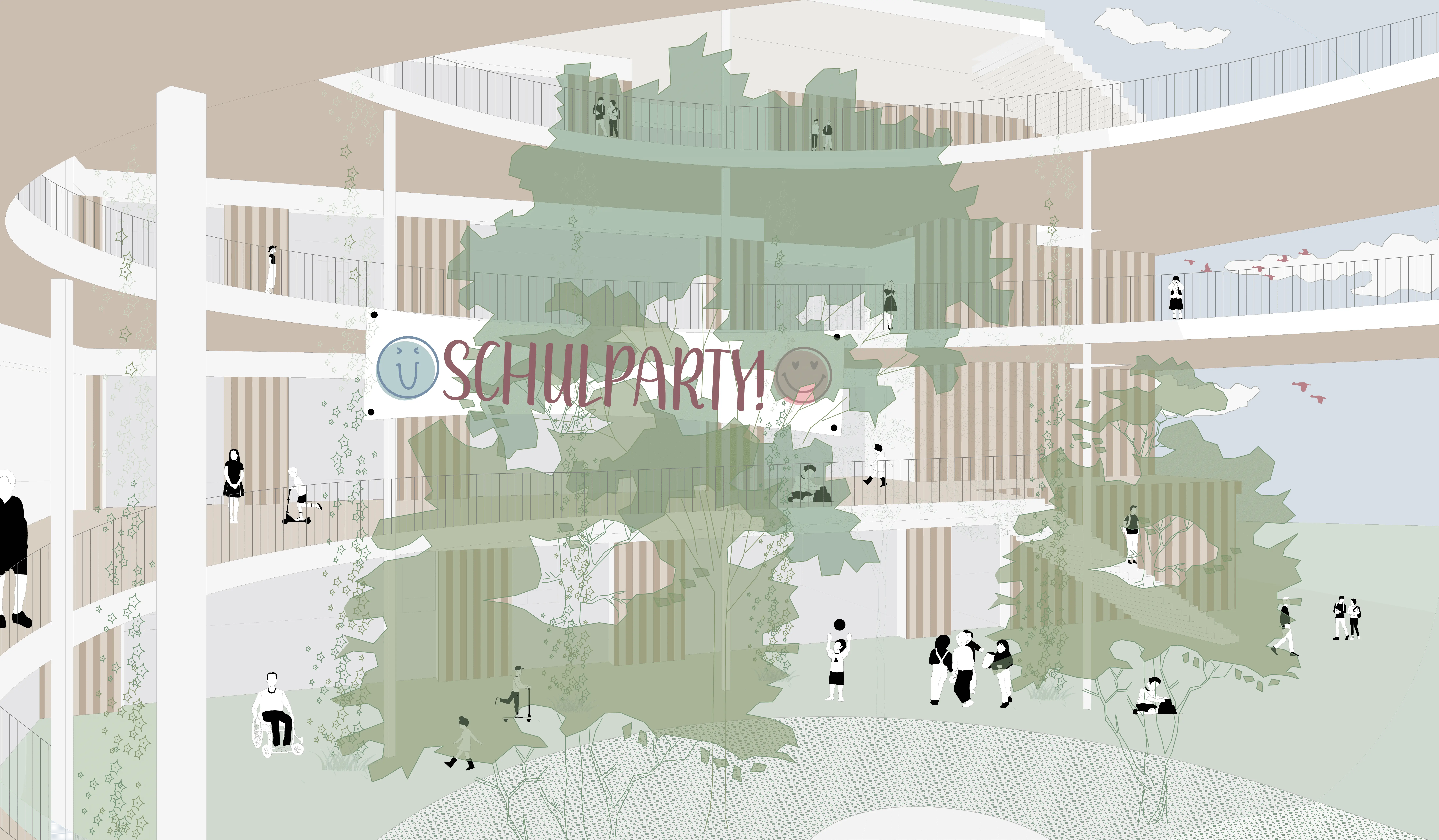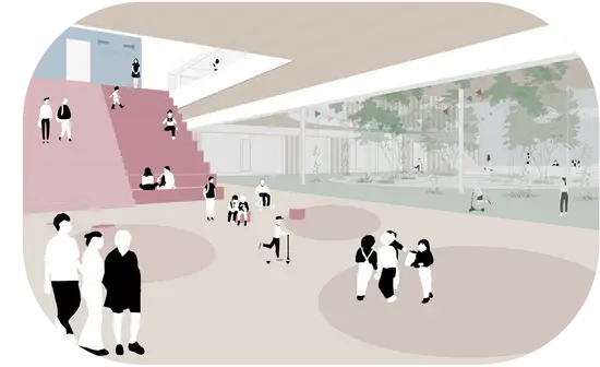 Vom südlichen Vorplatz aus führt der Weg durch vielfältige Bereiche, in denen Spiel, Bewegung, Lernen und Ruhe ineinandergreifen. In der Mitte dieses Stroms sammelt sich der Freiraum in einer ruhigen "Oase" mit Sitzinseln und Schatten, die eine hohe Aufenthaltsqualität bietet. Entlang des Weges reihen sich Spielbereiche, Bewegungszonen, ein Naschgarten und vielfältige Lernorte aneinander. Die Gestaltung ist bewusst ökologisch und strukturreich. Sie erinnert an die ruhige, naturnahe Stimmung der Alten Donau und fördert die Insektenvielfalt und Biodiversität. So wird der Außenraum selbst zu einem lebendigen Lern- und Lebensraum für die Schüler:innen.