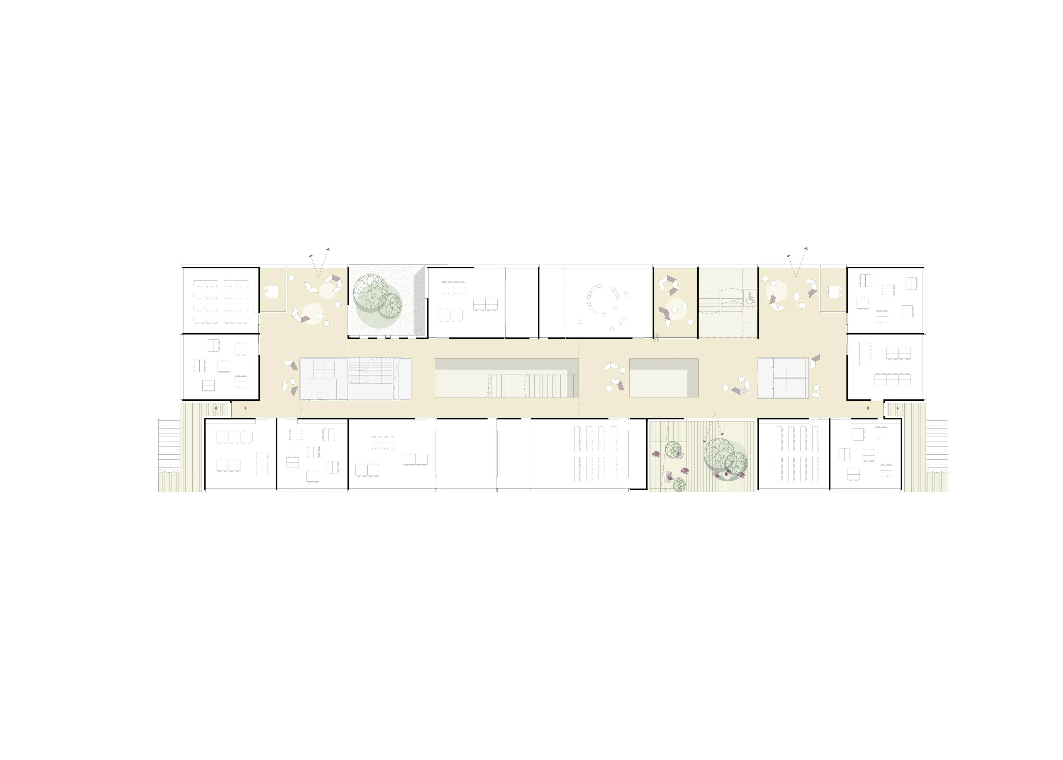 Treppen und offene Cluster steigen wie eine Kaskade nach oben und verbinden Innenräume mit grünen Außenbereichen. Der Dachbereich wird zum Sport- und Bewegungsraum, die vertikale Erschließung verwandelt das Gebäude selbst in einen lebendigen Schulhof.