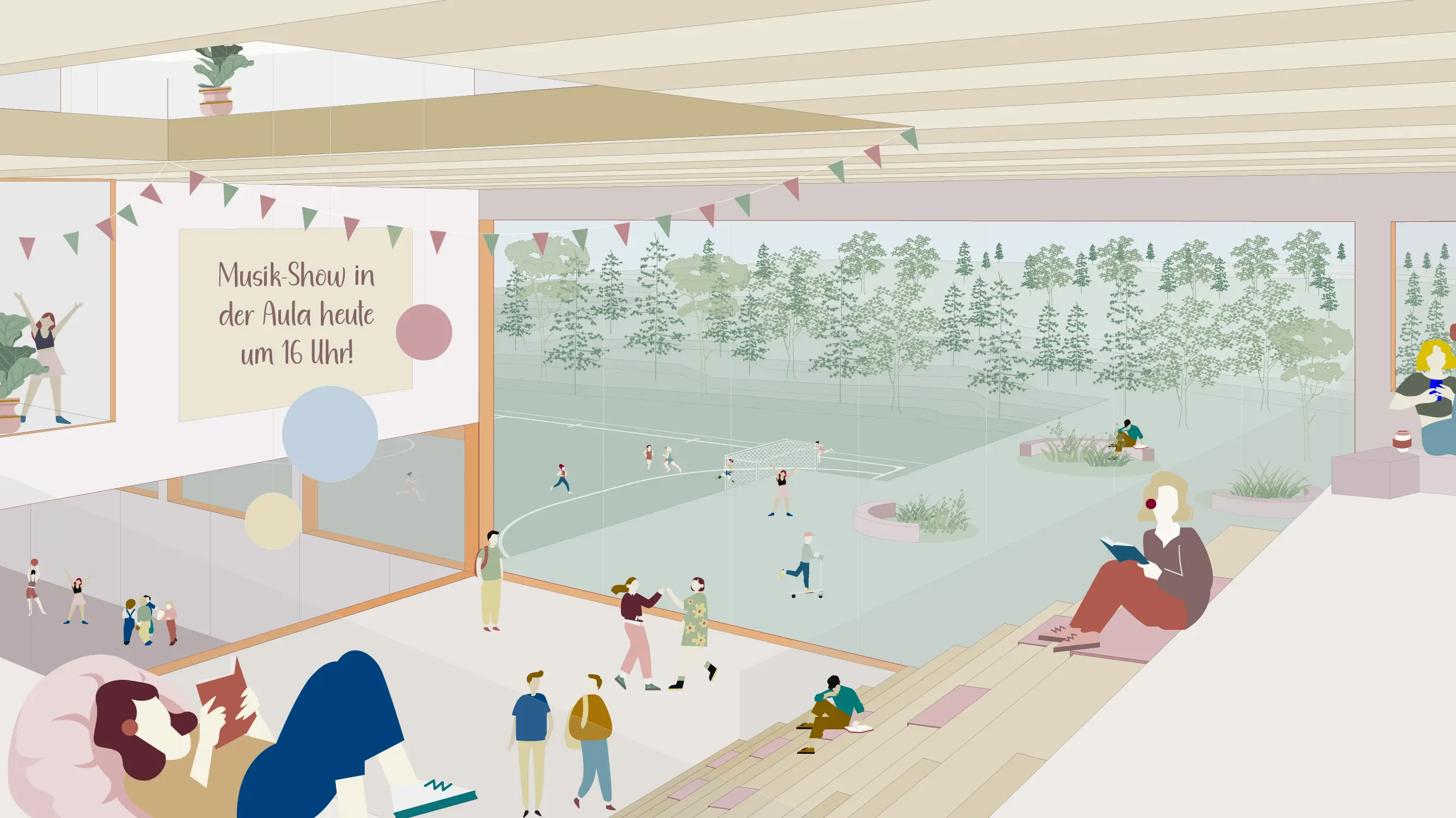 Die Aula als HerzstückIm Zentrum des Gebäudes liegt die Aula: ein „Lehrtheater“, das als Treffpunkt, Veranstaltungsraum und Aufenthaltsbereich dient. Sie bildet das pulsierende Herz der Schule und ermöglicht eine intuitive Orientierung im gesamten Gebäude.